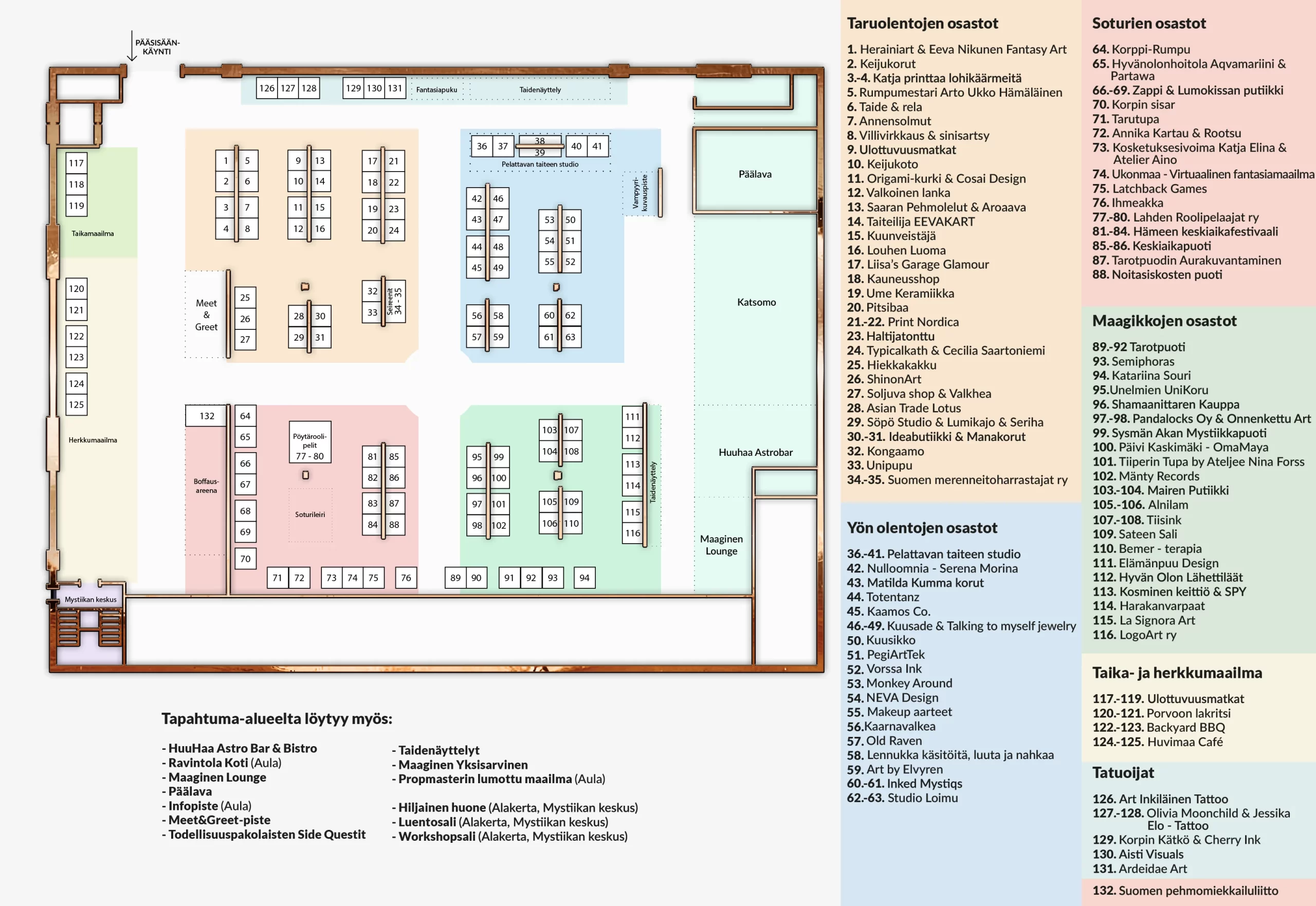 Myyjät, esiintyjät, yhteistyökumppanit, työpajaohjaajat, kutsuvieraat, median edustajat, fantasiapukukilpailun finalistit, pääsylippuarvonnan voittaneet ja talkoolaiset ilmoittautuvat tapahtuman Info-pisteellä.